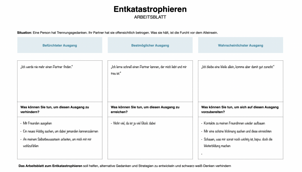 Entkastrophieren ist ein furchtbares Wort, aber eine ziemlich klasse Übung. Dazu nimmst du dir einen Zettel und machst drei Spalten. Diese betitelst du mit: