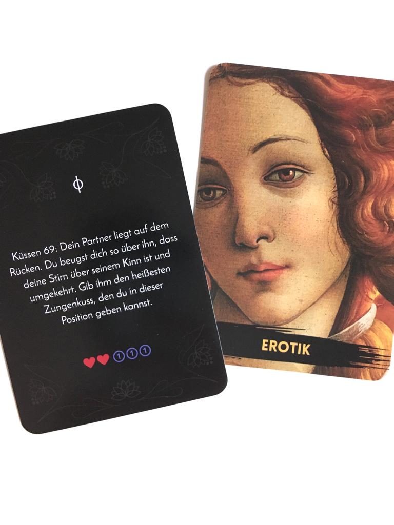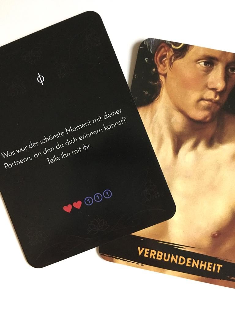 Das Spiel ist in vier Phasen aufgeteilt, die sich von Verbundenheit über Spaß und Erotik bis hin zu Sex steigern. Möchte man sich erst einmal nur besser Kennenlernen oder das Spiel mit einem befreundeten Pärchen spielen wollen, kann man sich zunächst auf die ersten beiden Phasen beschränken. Für die beiden weiteren Phasen wäre aus unserer Sicht ein gewisses Maß an Vertrautheit bzw. Vertrauen schon zu empfehlen.